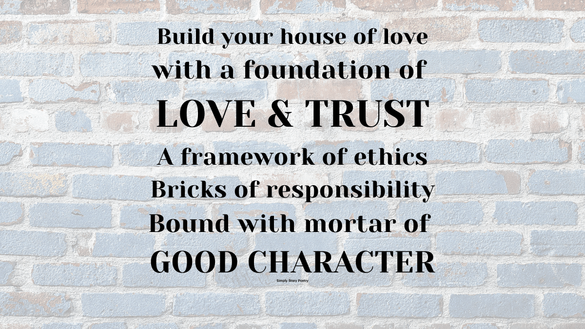 Build your house of love with a foundation of love and trust, a framework of ethics, bricks of responsibility, bound with mortar of good character.