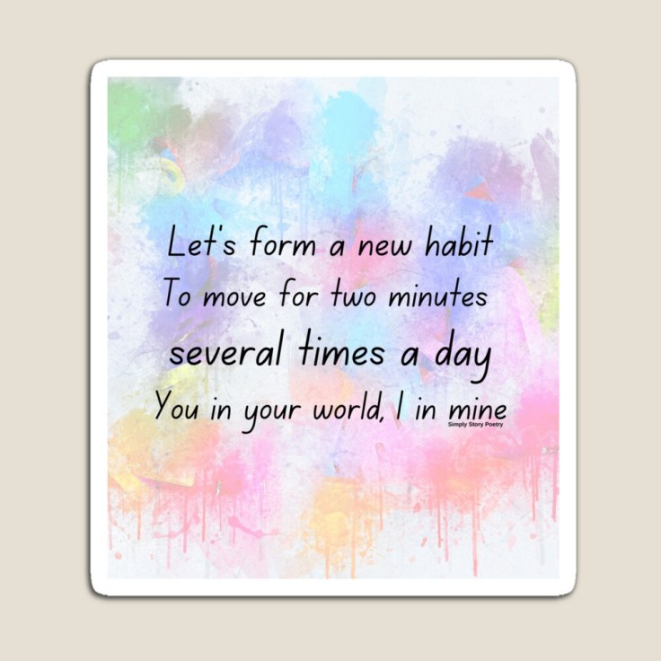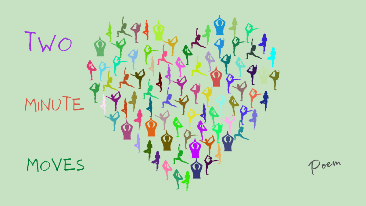 I wrote this poem after reading the book titled ‘Two Minute Moves’ by Lizzy Williamson. I found this book on an early morning walk during Australia’s complete COVID-19 lockdown. What a great idea to get up from the computer to exercise for two minutes and repeat it throughout the day. I bought copies of the book for my friends to encourage each other to exercise daily. Even though we may live apart, we can take two minutes to think of each other while we do our two minutes of exercise. Beverley Joy.