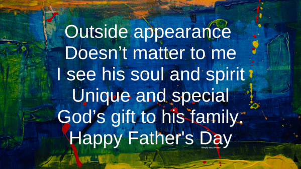 Outside appearance doesn't matter to me I see his soul and spirit, unique and special God's gift to his family. From my poem 'Dad, You Are A Gentleman' Beverley Joy of Simply Story Poetry You can BUY my poem and verse products at beverleyjoy.redbubble.com
