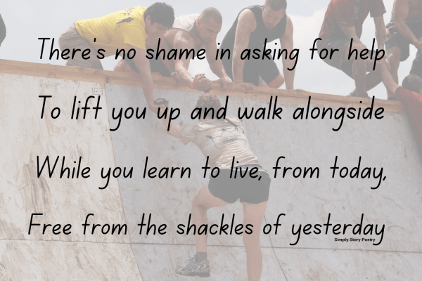 There's no shame in asking for help To lift you up and walk alongside While you learn to live, from today, Free from the shackles of yesterday. A verse from my poem 'Choose to Forgive' Beverley Joy of Simply Story Poetry You can BUY my poems and verses at beverleyjoy.redbubble.com