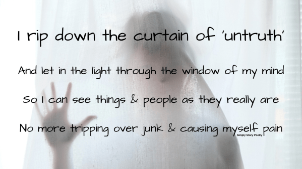 I rip down the curtain of 'untruth' And let in the light through the window of my mind So I can see things and people as they really are No more tripping over junk and causing myself pain. A verse from my poem 'Clear Up My Cluttered Mind' Beverley Joy of Simply Story Poetry You... Continue Reading →