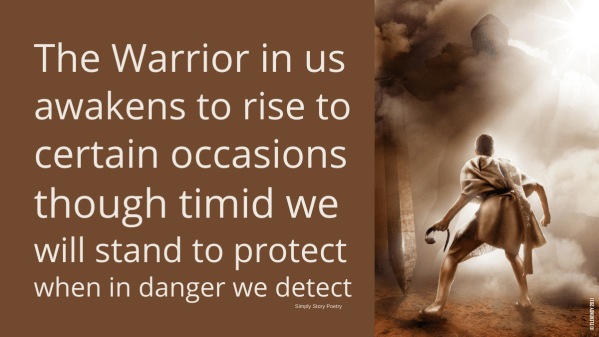 The warrior in us awakens To rise to certain occasions Though timid we will stand To protect when in danger we detect. A verse from my poem 'Archetypes of Life' Beverley Joy of Simply Story Poetry You can BUY my poems and verses at beverleyjoy.redbubble.com Click on image