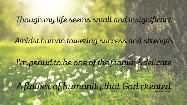 Though my life seems small and insignificant Amidst human towering success and strength I'm proud to be one of the fragile and delicate A flower of humanity that God created. A verse from my poem 'A Delicate Flower' Beverley Joy of Simply Story Poetry You can BUY my poems and verses at beverleyjoy.redbubble.com