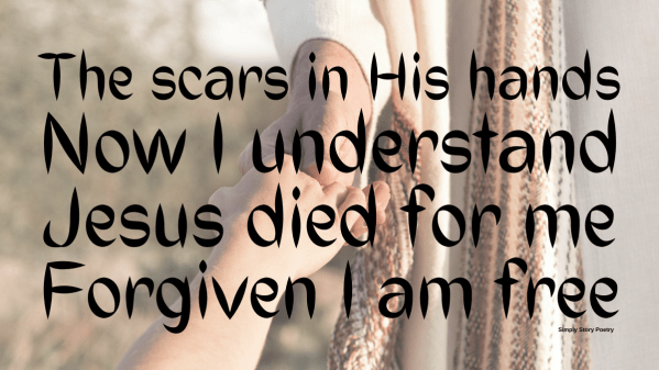 The scars in His hands Now I understand Jesus died for me Forgiven I am free. A verse from my poem 'Once I Was blind, But Now I See' Beverley Joy of Simply Story Poetry