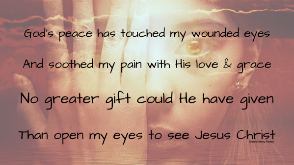 God's peace has touched my wounded eyes And soothed my pain with His love and grace No greater gift could He have given Than open my eyes to see Jesus Christ. A verse from my poem 'Once I was Blind, But Now I See' Beverley Joy of Simply Story Poetry