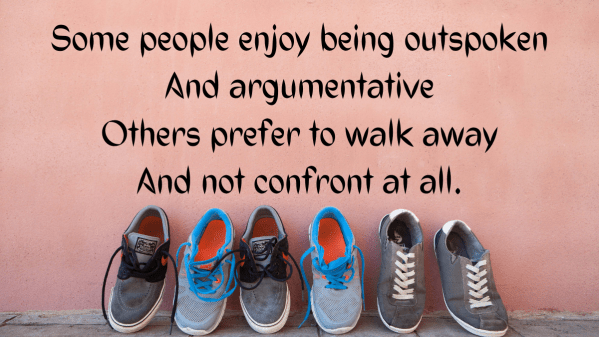 Some people enjoy being outspoken And argumentative Others prefer to walk away And not confront at all. A verse from my poem 'What is Happiness?' Beverley Joy of Simply Story Poetry