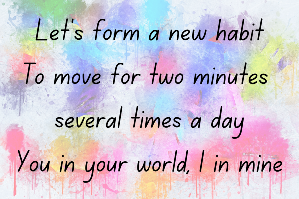 Let's form a new habit To move for two minutes Several times a day You in your world, I in mine. A verse from my poem titled Two Minute Moves Beverley Joy of Simply Story Poetry You can BUY my poems and verses at http://beverleyjoy.redbubble.com