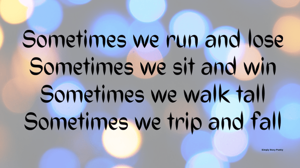 Sometimes we run and lose Sometimes we sit and win Sometimes we walk tall Sometimes we trip and fall. A verse from my poem 'Everyday Love' Beverley Joy of Simply Story Poetry You can BUY my poems and verses at beverleyjoy.redbubble.com Click on the image to go to my shop