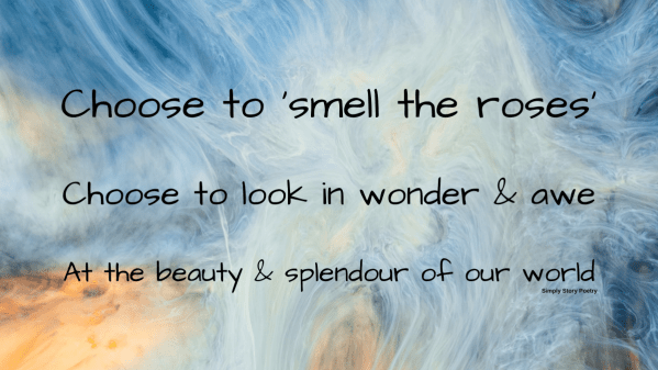 Choose to smell the roses Choose to look in wonder and awe At the beauty and splendour of our world. A verse from my poem 'Love's Ripple Effect' Beverley Joy of Simply Story Poetry You can BUY my poems and verses at beverleyjoy.redbubble.com click on image