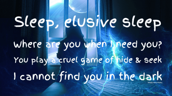 Sleep, elusive sleep Where are you when I need you? You play a cruel game of 'hide and seek' I cannot find you in the dark. A verse from my poem 'The Love of Sleep'. Beverley Joy of Simply Story Poetry You can BUY my poems and verses at beverleyjoy.redbubble.com Image by Ajay Kumar Singh... Continue Reading →