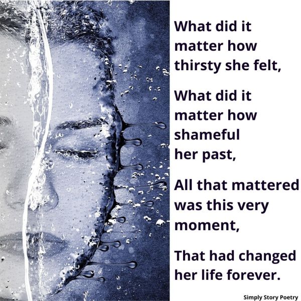 Her craving for love and faithfulness The longing deep in her heart Human love could not satisfy But God's love quenched her thirst. A verse from the poem 'Thirst Quenching' is based on the Bible story of The Woman at the Well. Beverley Joy of Simply Story Poetry