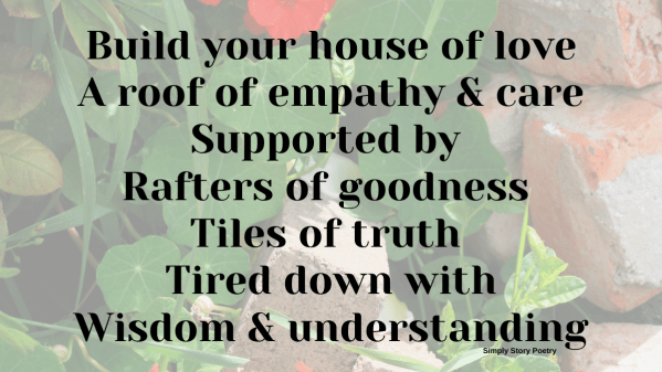 Build Your House of Love, a roof of empathy and care, supported by rafters of goodness, tiles of truth, tired down with wisdom and understanding. A verse from my poem 'Build Your House of Love.' Beverley Joy of Simply Story Poetry You can BUY my poems and verses at beverleyjoy.redbubble.com